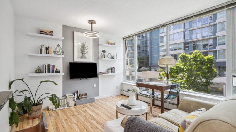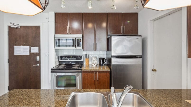 One-bedroom plus den modern apartment downtown. The den can be used as an office or bedroom. A upgraded bathroom. Close to Rogers Arena, Train, coffee, restaurants, and grocery. Kitchenware, laundry provided. Free Swimming poor hottub, Sauna ,Gym and free 1 security parking.