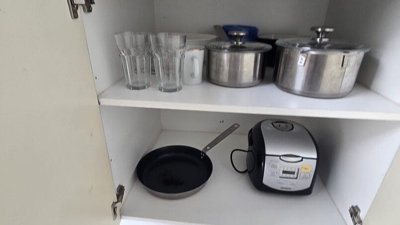 🍳 Kitchenette with microwave, fridge, and induction cooktop. Provide full set dishes, cookware.